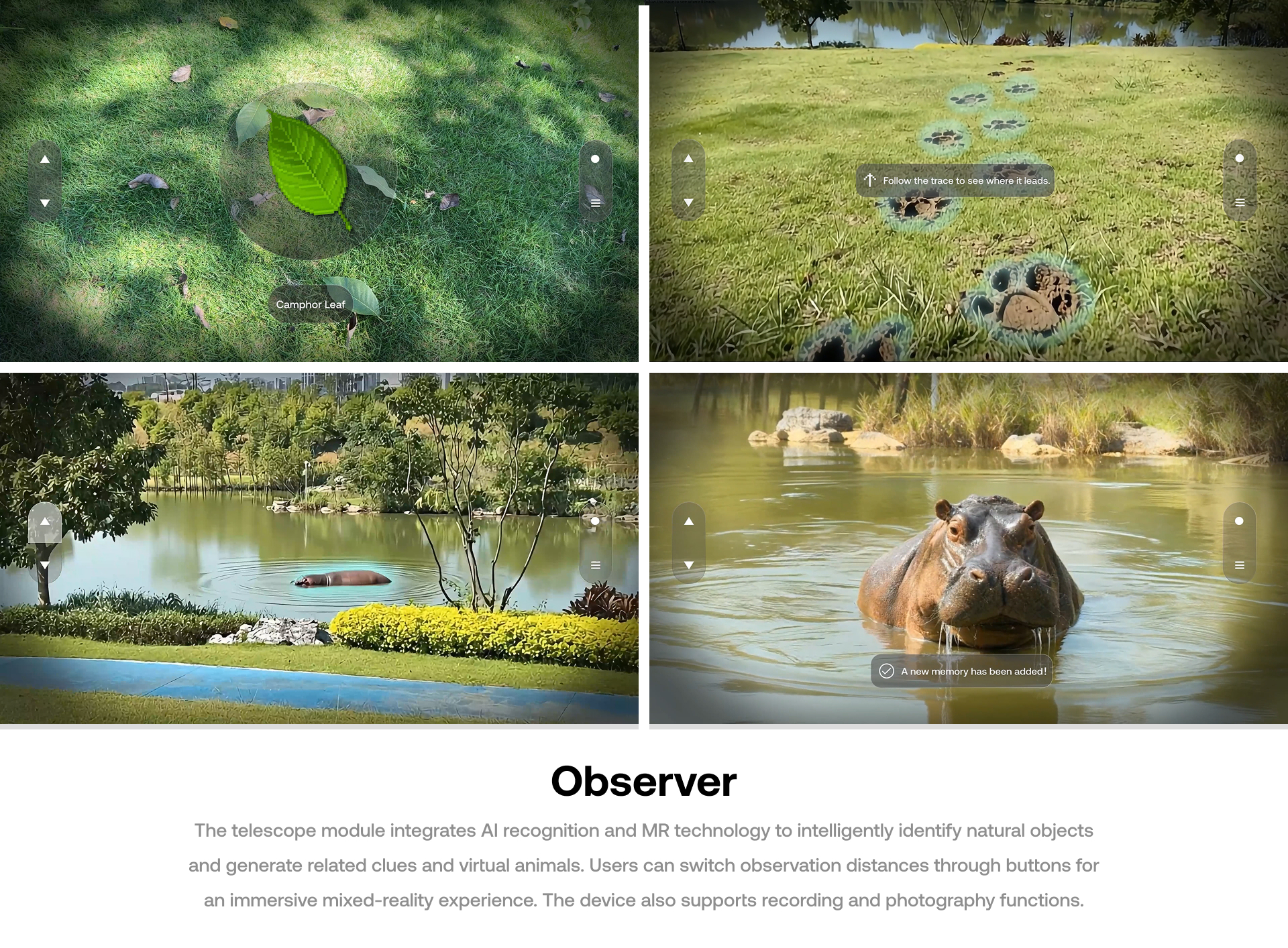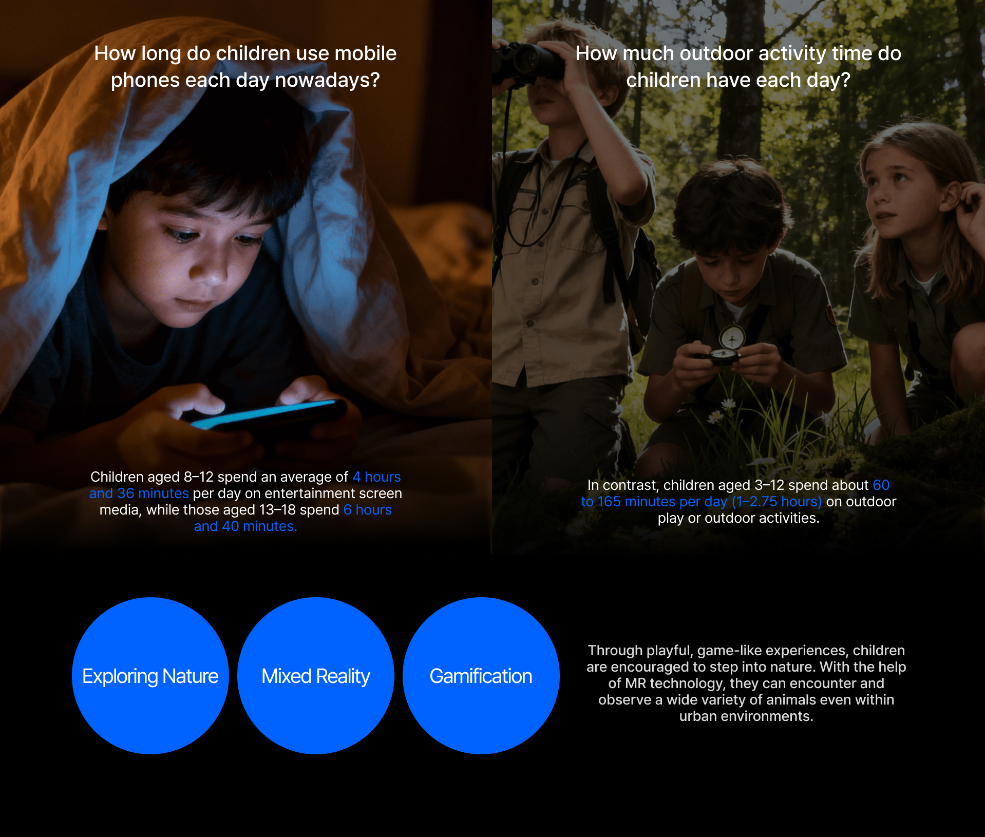 TRAX is an outdoor exploration kit that encourages children to explore nature through a gamified experience. Using MR technology, it turns nearby natural spaces into fun and engaging adventure areas. Children are given missions such as discovering natural objects and collecting sounds in their surroundings, which eventually reveal a virtual wild animal. The experience blends reality and imagination, helping children reconnect with nature through play.