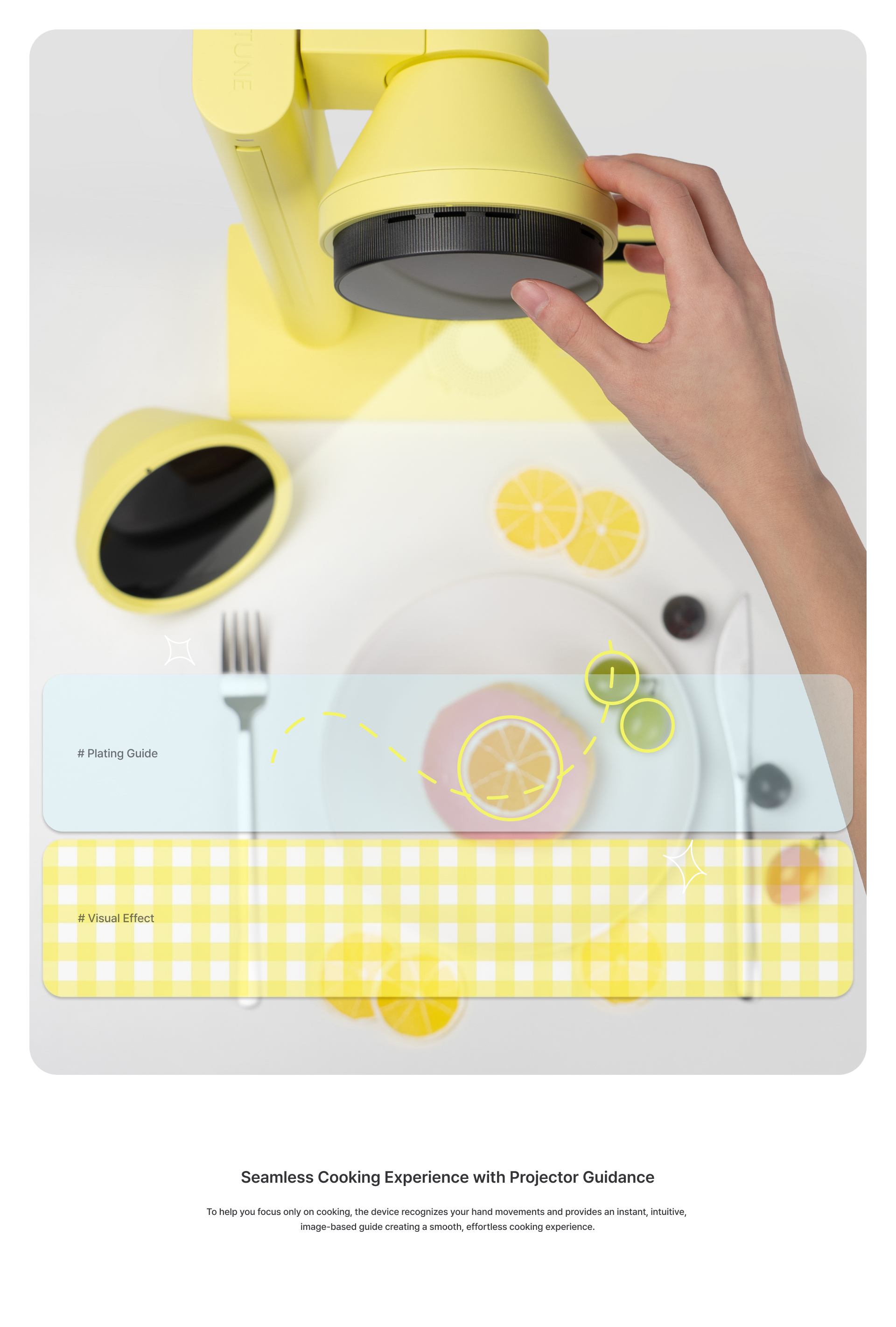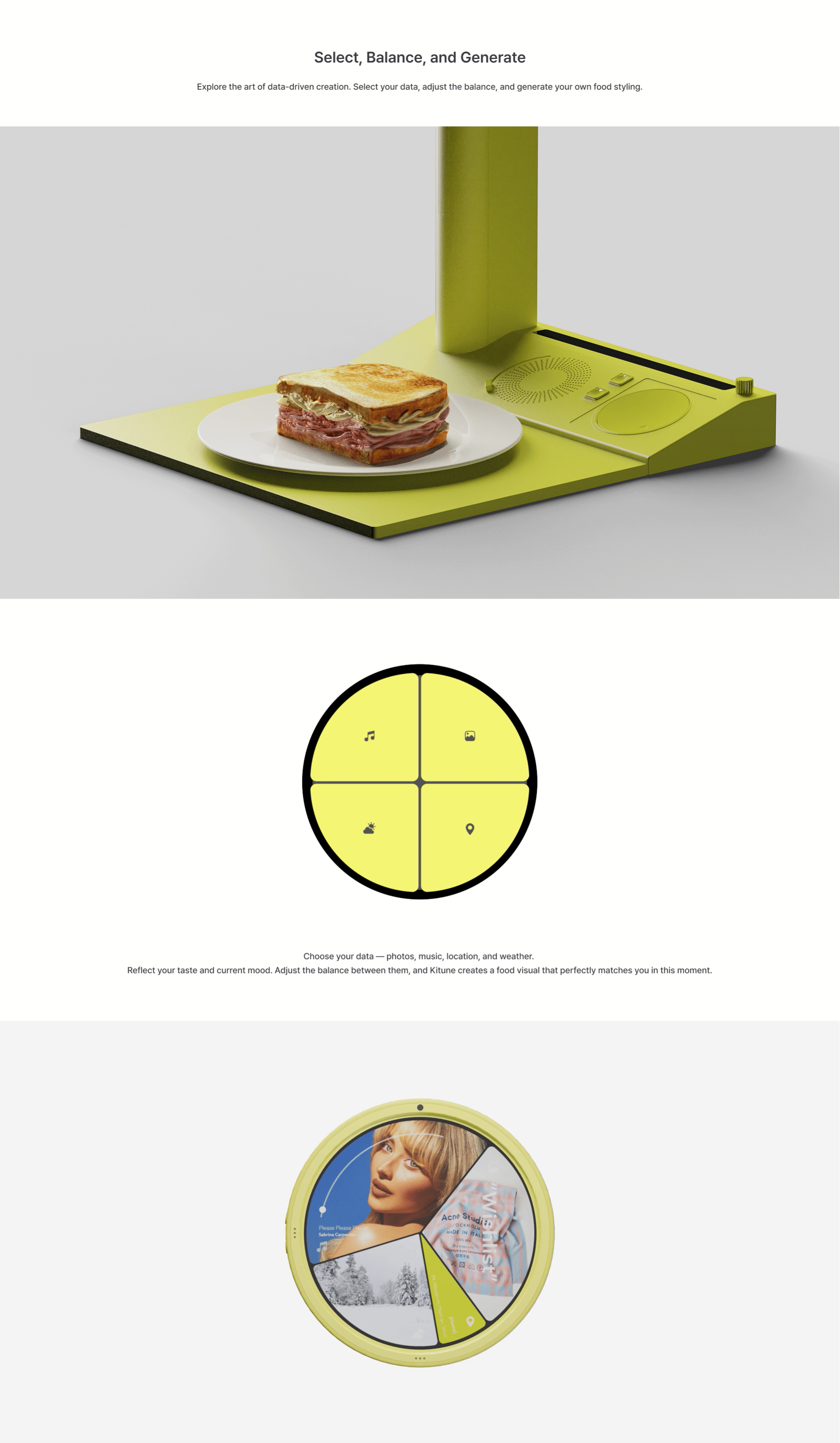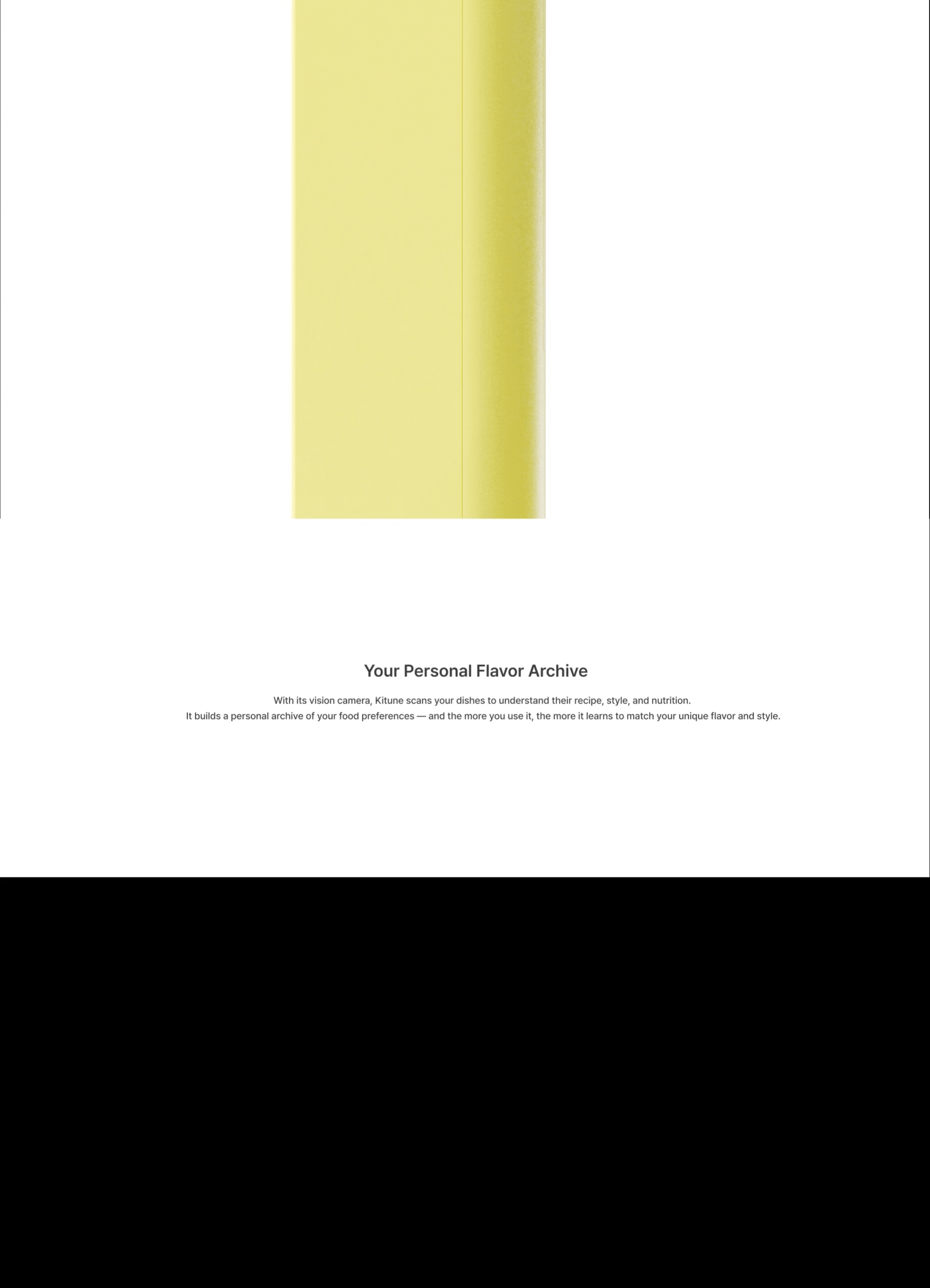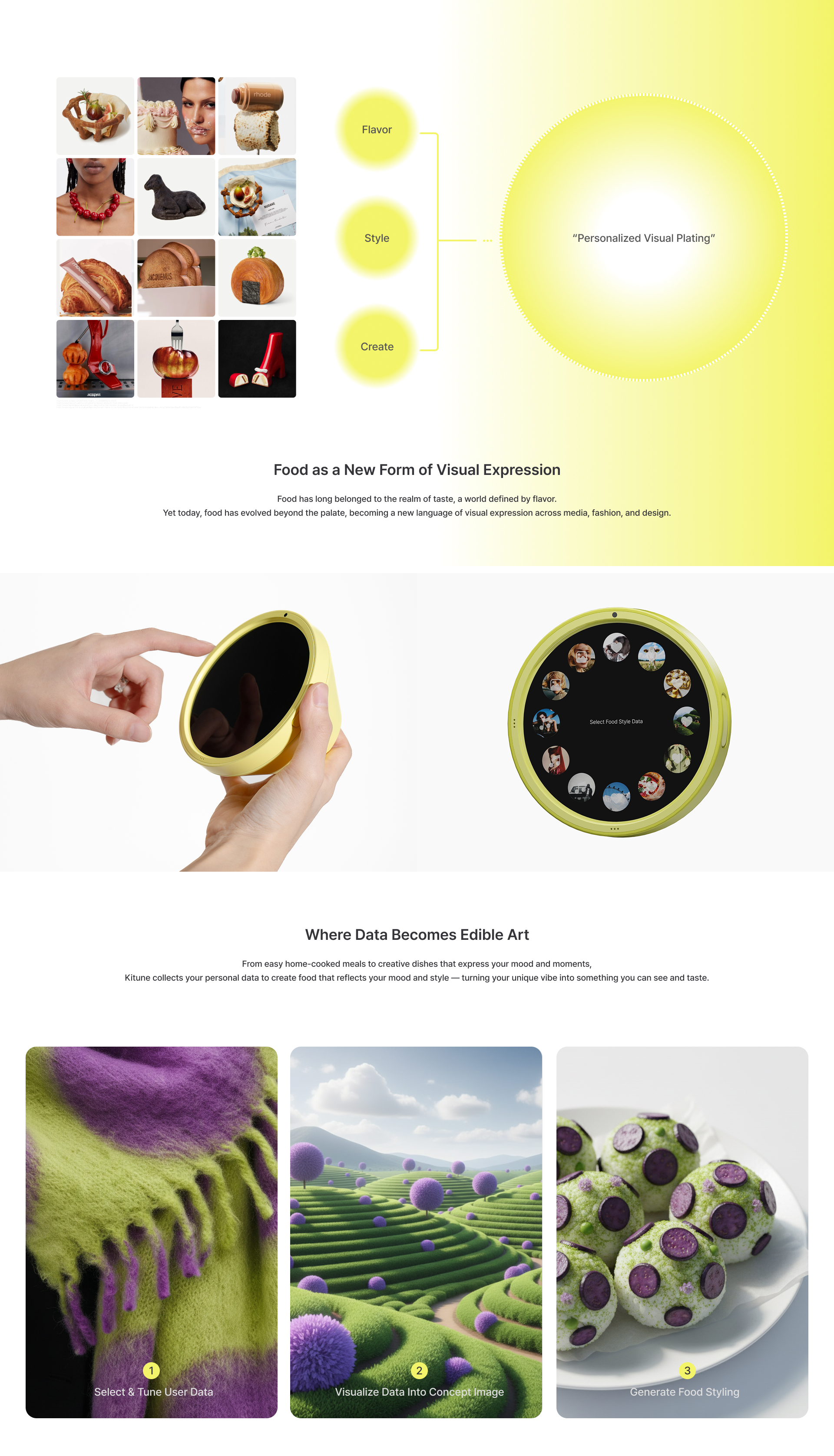 KITUNE offers a personalized dining experience that enhances your visual satisfaction. By combining your personal data, it generates visual concepts that match the mood of the moment and completes your plating. With KITUNE, your cooking becomes more than a meal, it becomes a work of art.