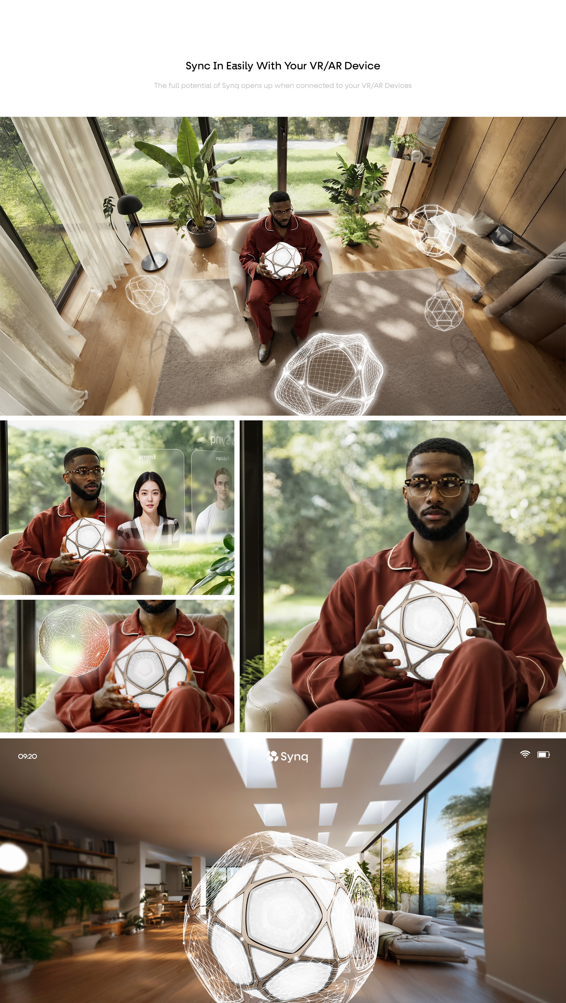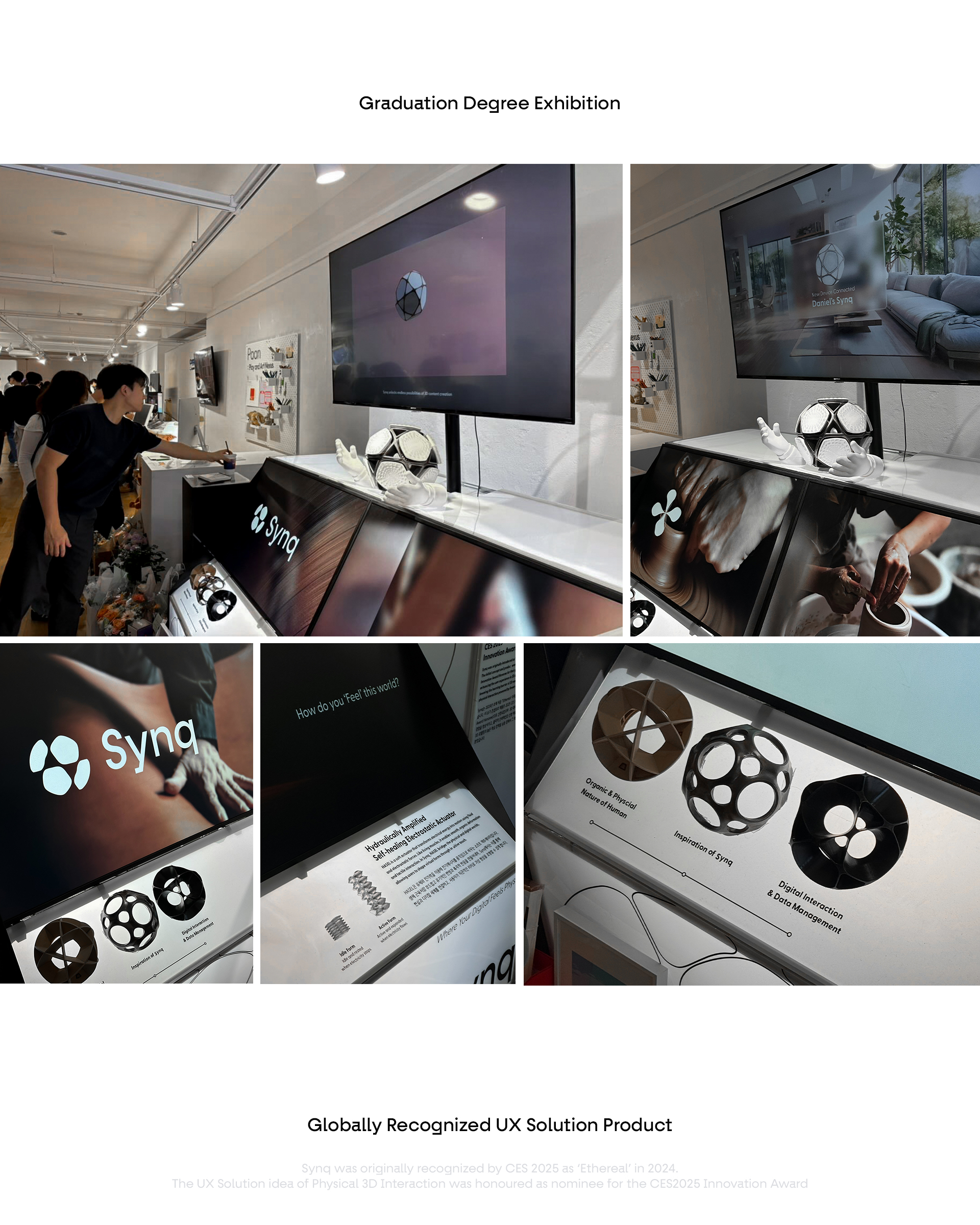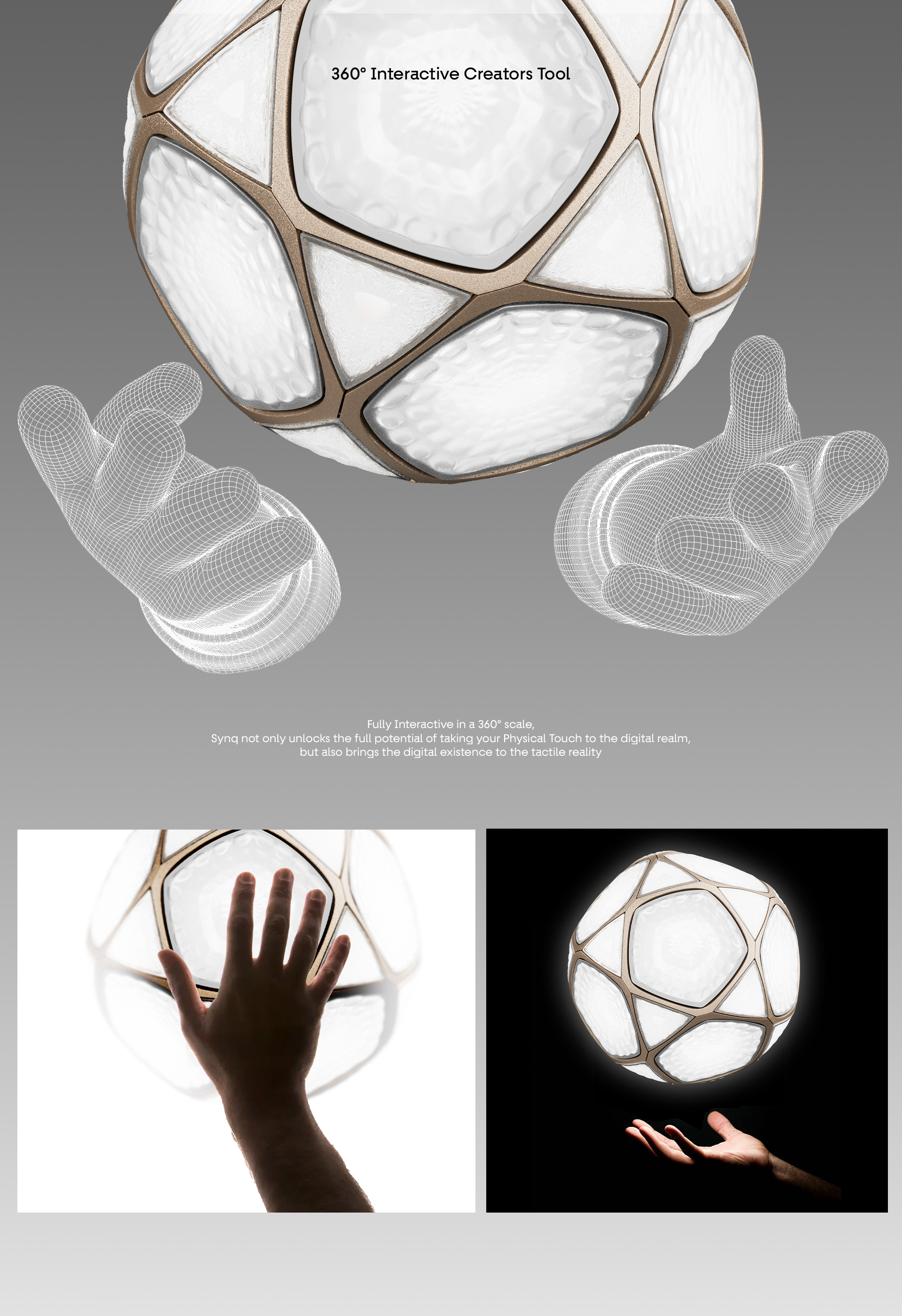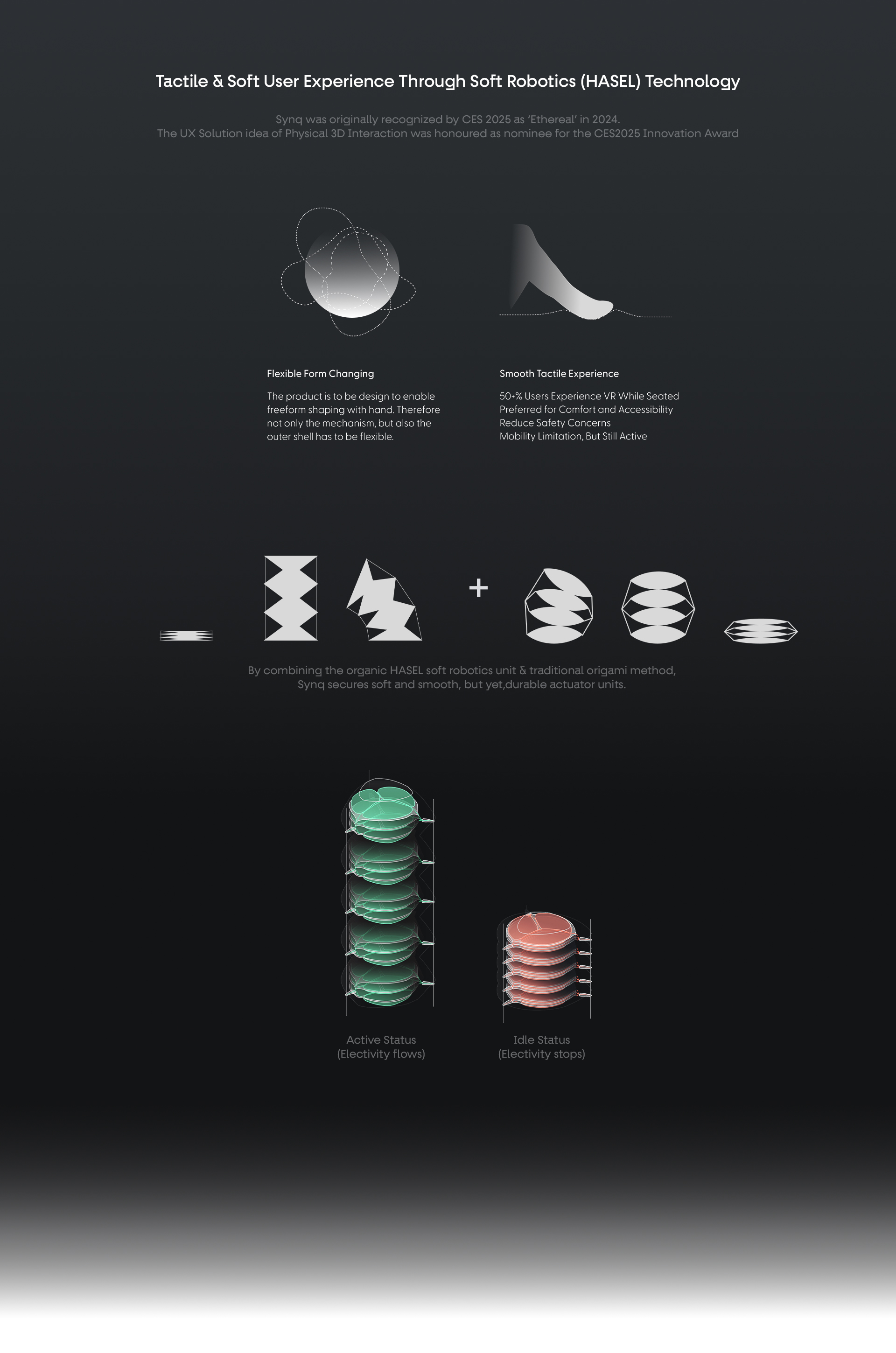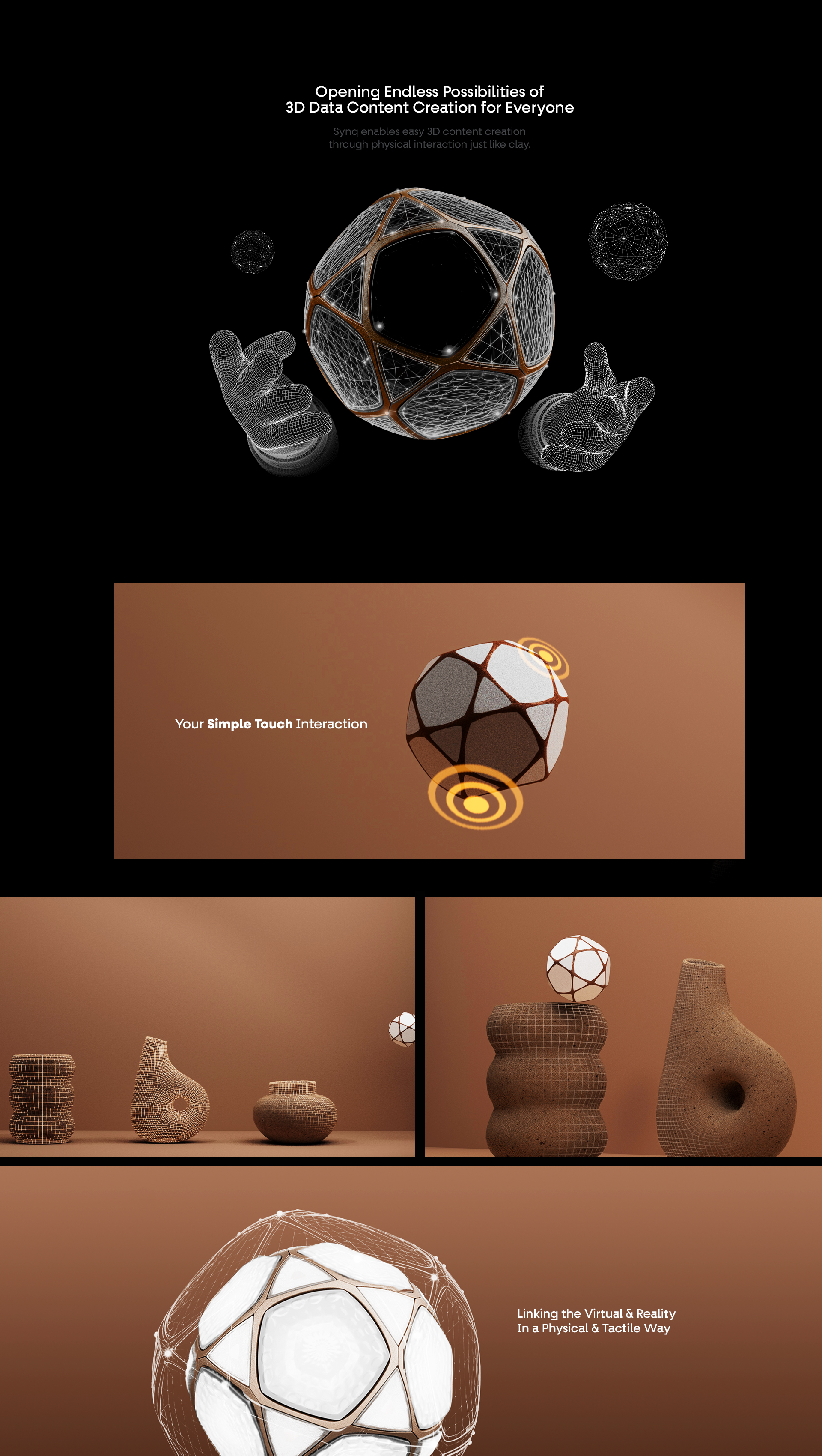 Synq is an innovative digital-twin creation tool that lets users shape and interact with 3D data through tangible motion, as if molding clay. By physically manipulating the device, creators can form and experience digital content in real time. Powered by HASEL soft-robotic actuators, Synq delivers smooth, lifelike tactile feedback, bridging the virtual and physical worlds with a sense of organic responsiveness.