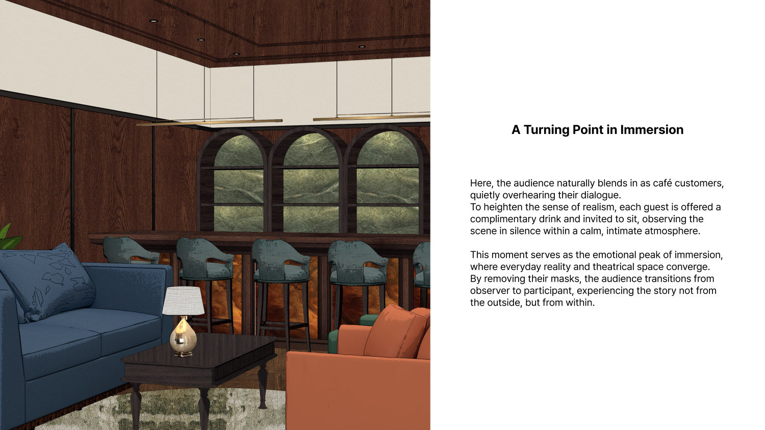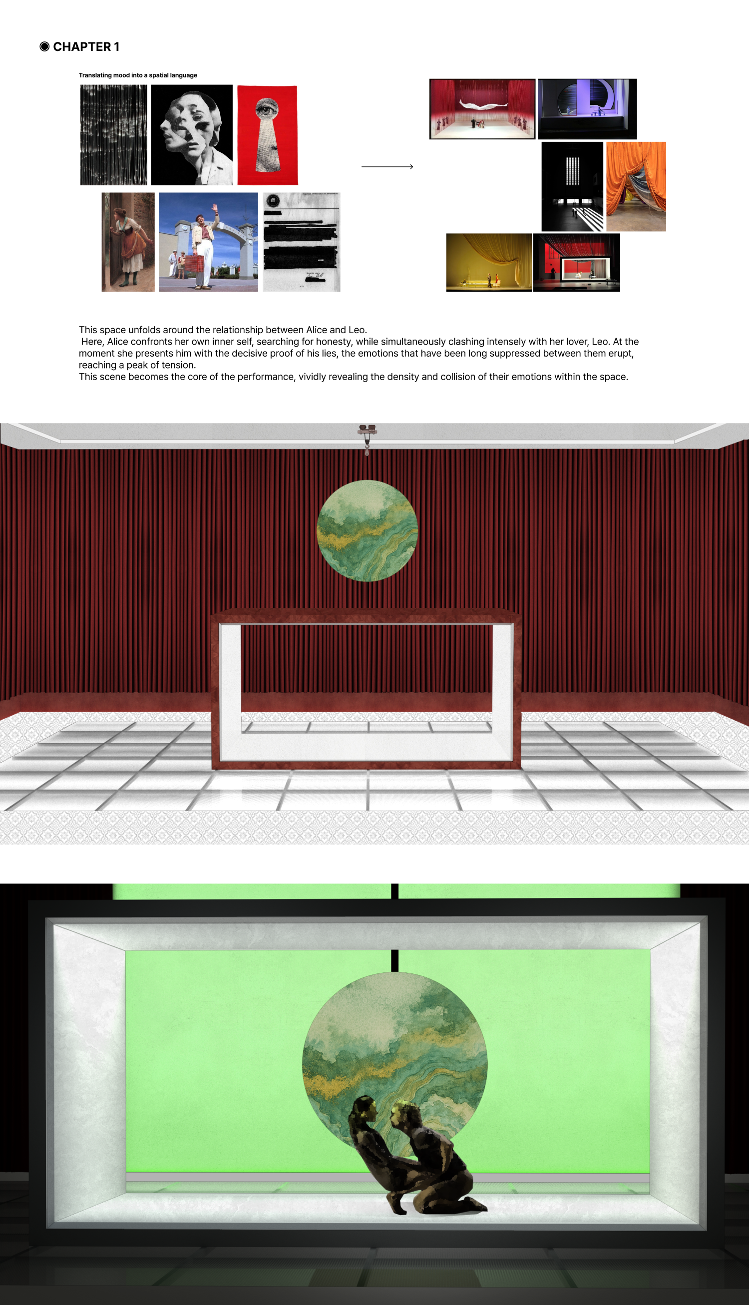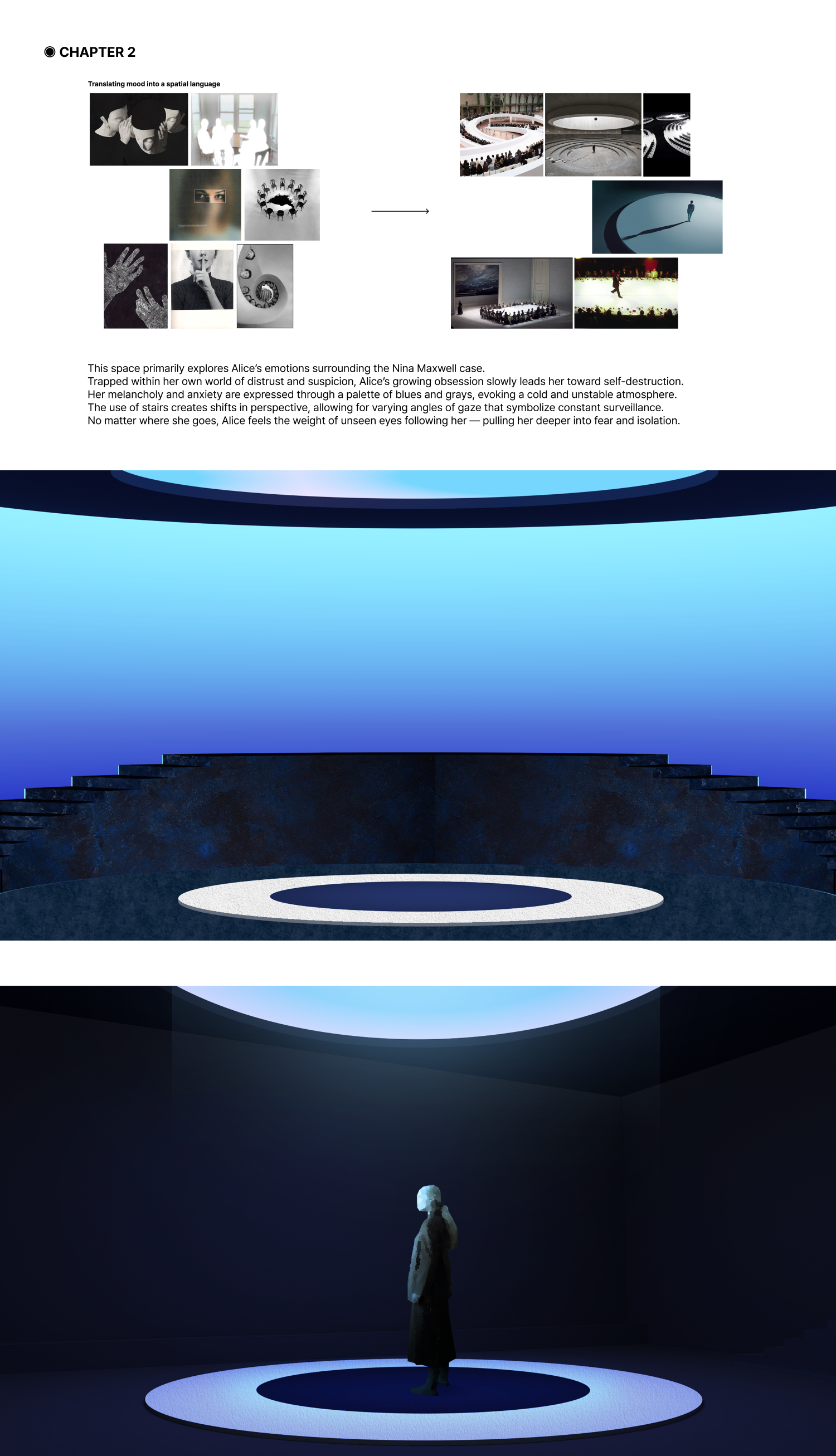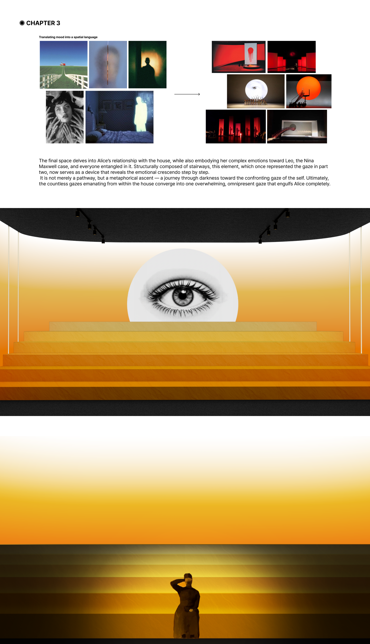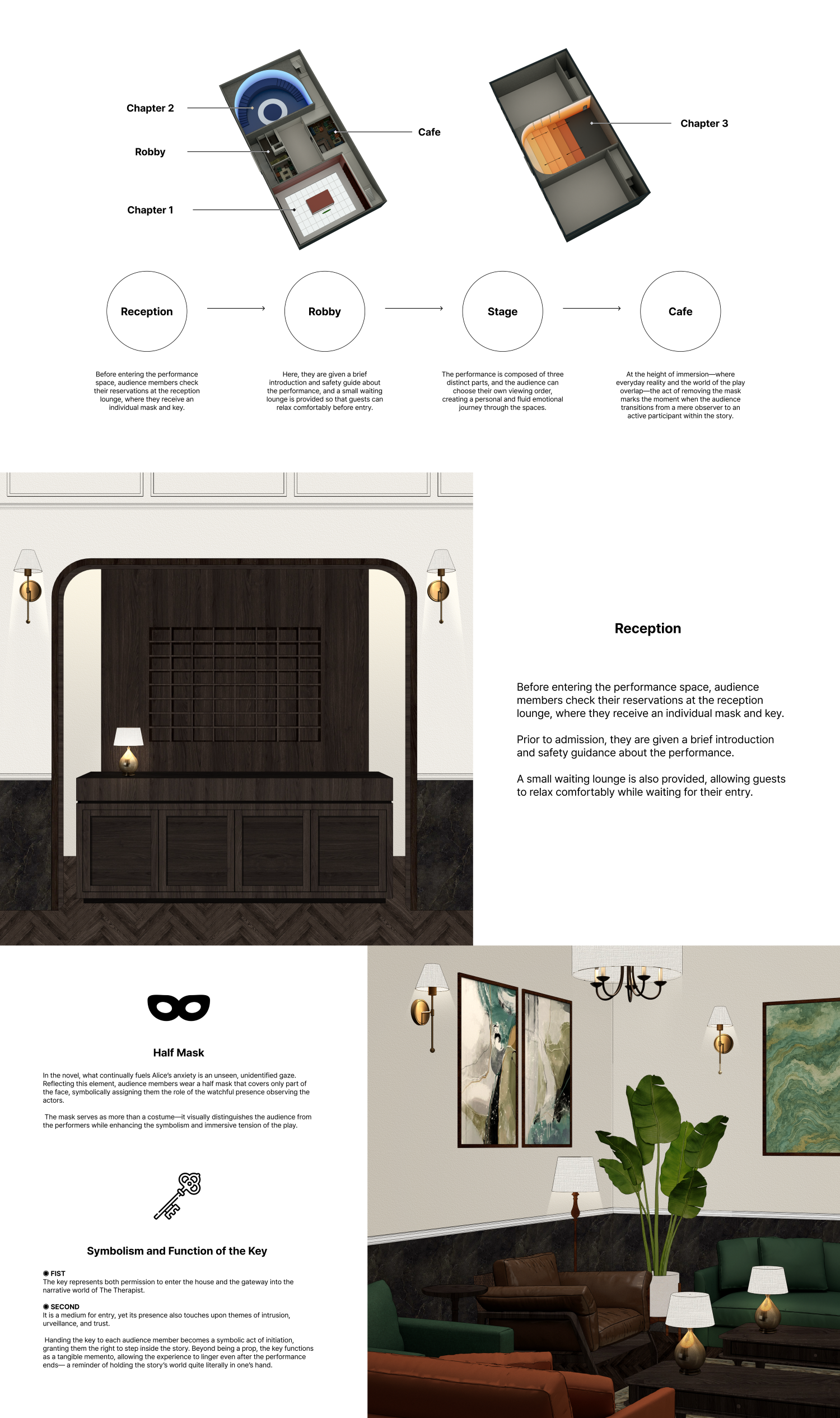 This project is an emotion-centered immersive performance inspired by The Therapist. It visualizes Alice’s emotions through three abstract spaces, allowing the audience to follow her psychological journey through movement and experience. Each space serves as a stage of emotion, where color, light, and structure express her anxiety, doubt, and isolation. As the audience walks through these spaces, they step into Alice’s inner world— feeling her unease, the invisible gazes that surround her, and the quiet tension that connects her emotions with their own.
