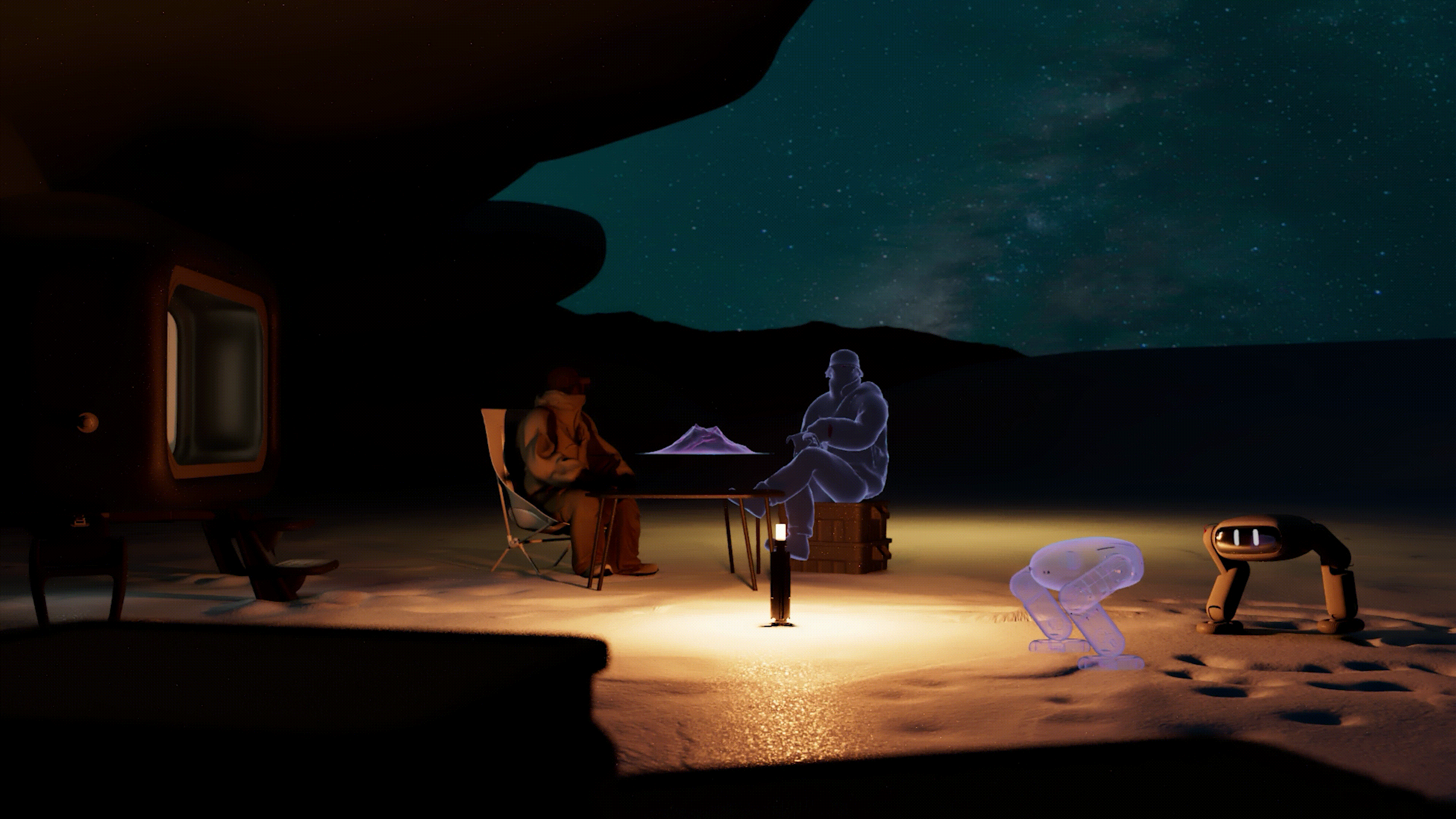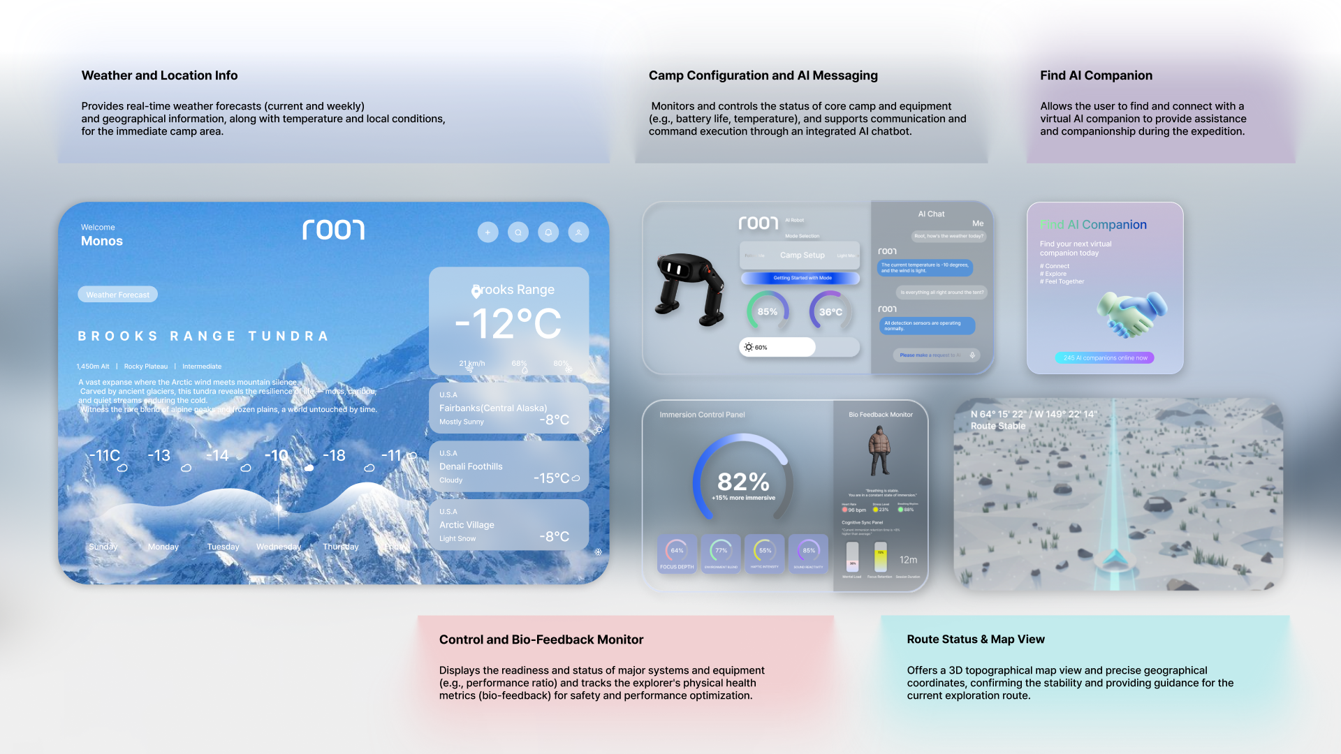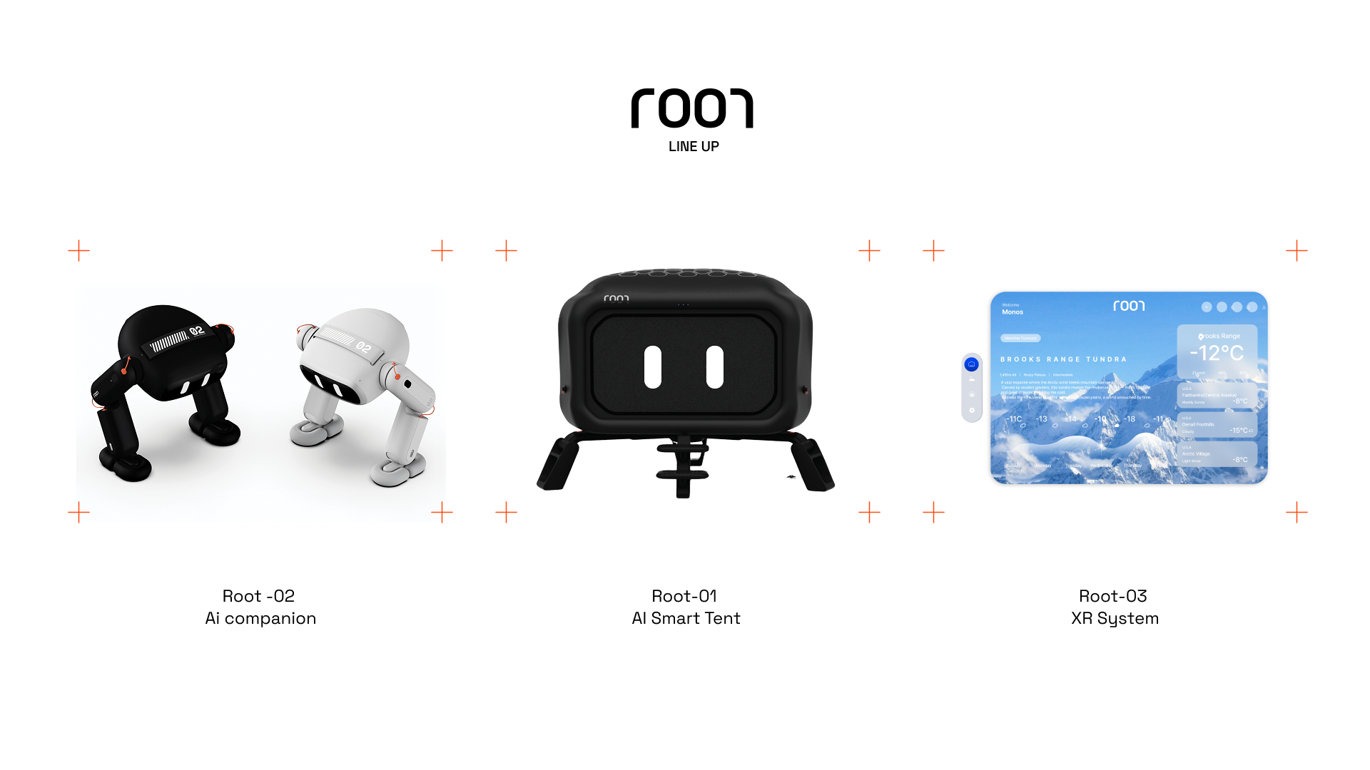 ROOT proposes a new coexistence model for a climate-challenged Earth, emphasizing AI-human collaboration. It centers on three components: an AI companion robot, an inflatable AI tent, and XR camping experiences. Users travel with the robot, utilizing XR glasses to transform real environments into surreal virtual landscapes. The AI tent offers a multi-sensory environment via spatial audio and 3D content. ROOT ultimately shows the potential for a New Ecology where humans, AI, and nature forge a symbiotic future.