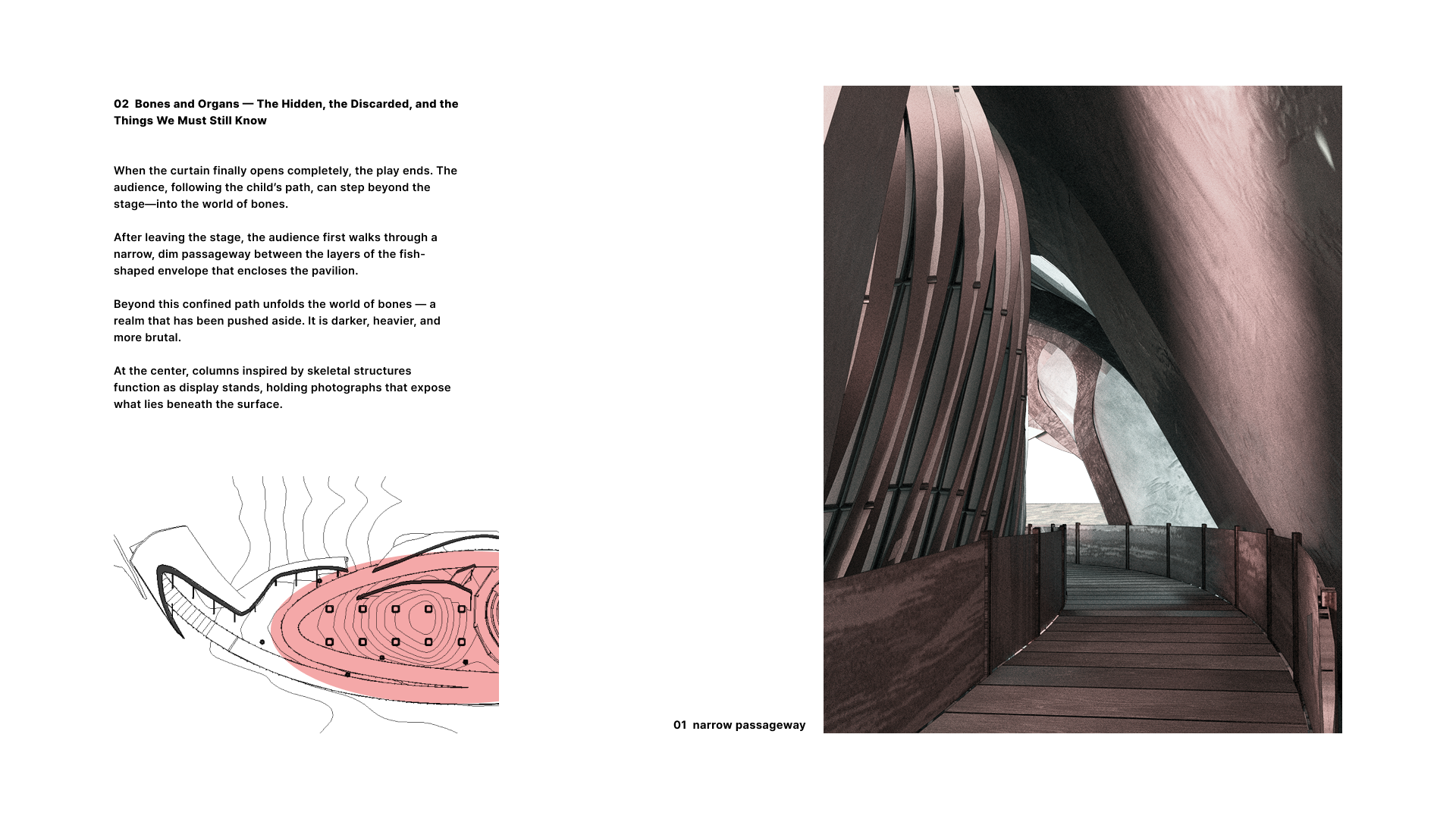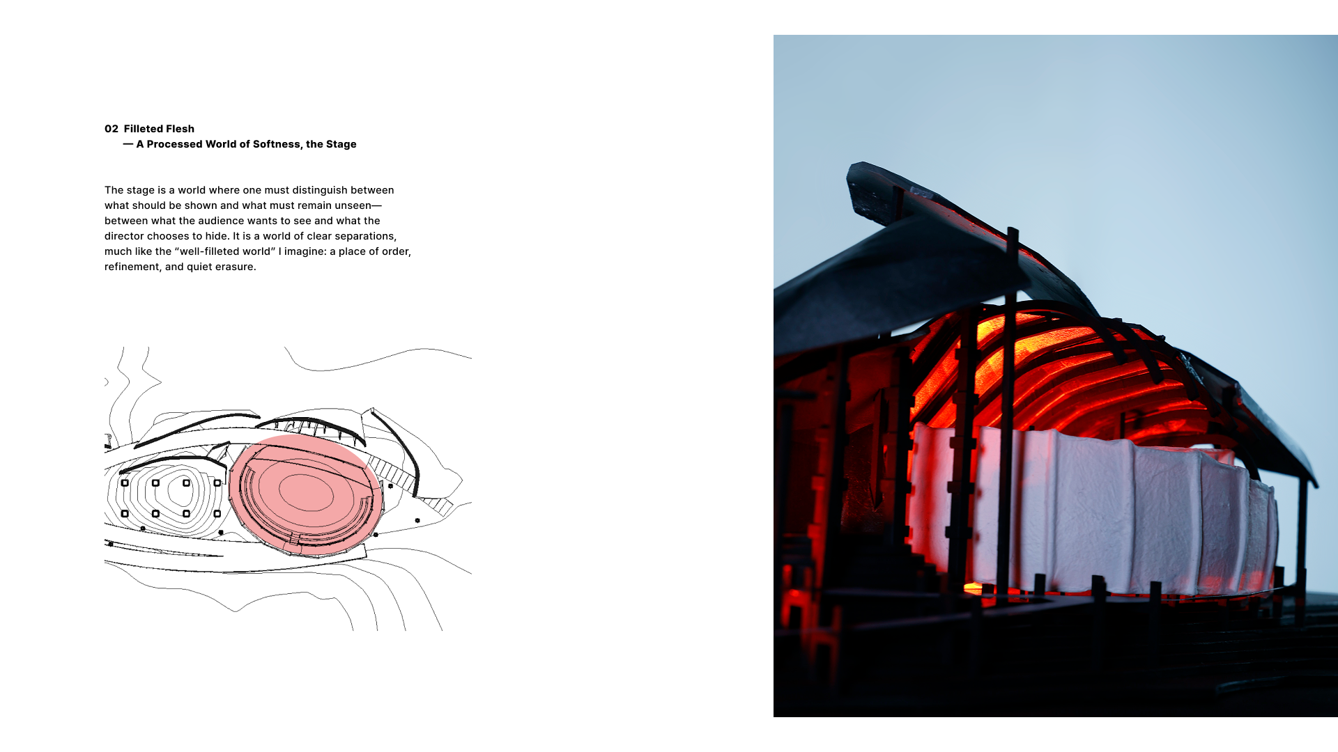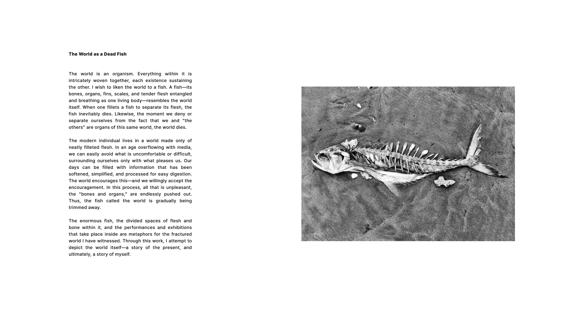 In a world where discomfort is trimmed away, only soft and pleasant flesh remains. What once breathed as a whole—bones, organs, and skin intertwined—has been neatly filleted into consumable pieces. This work envisions the world as a dissected fish, a body losing its unity in the name of convenience and clarity. As the flesh separates from the bone, life quietly departs. What is left may be clean, but it is no longer alive.