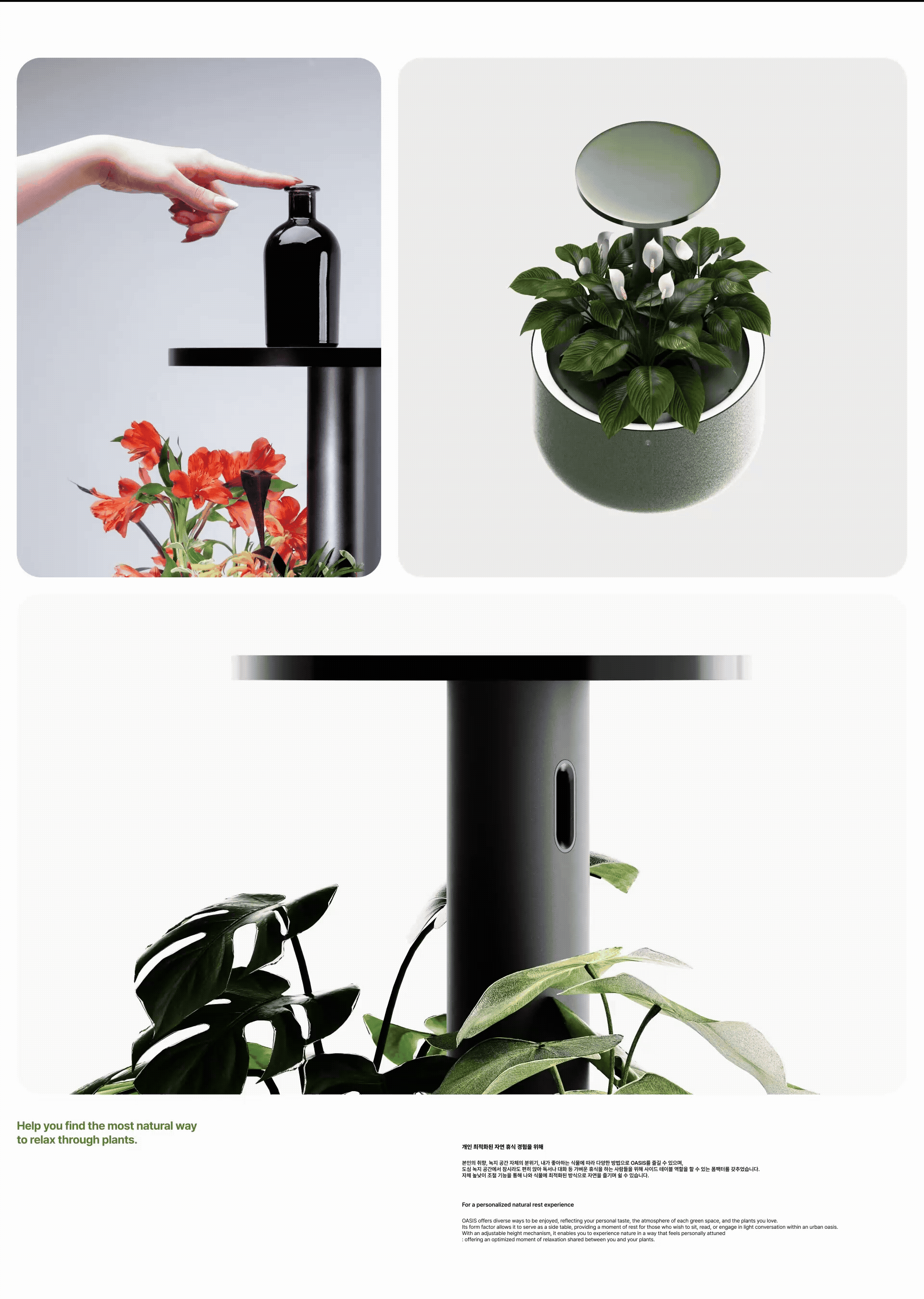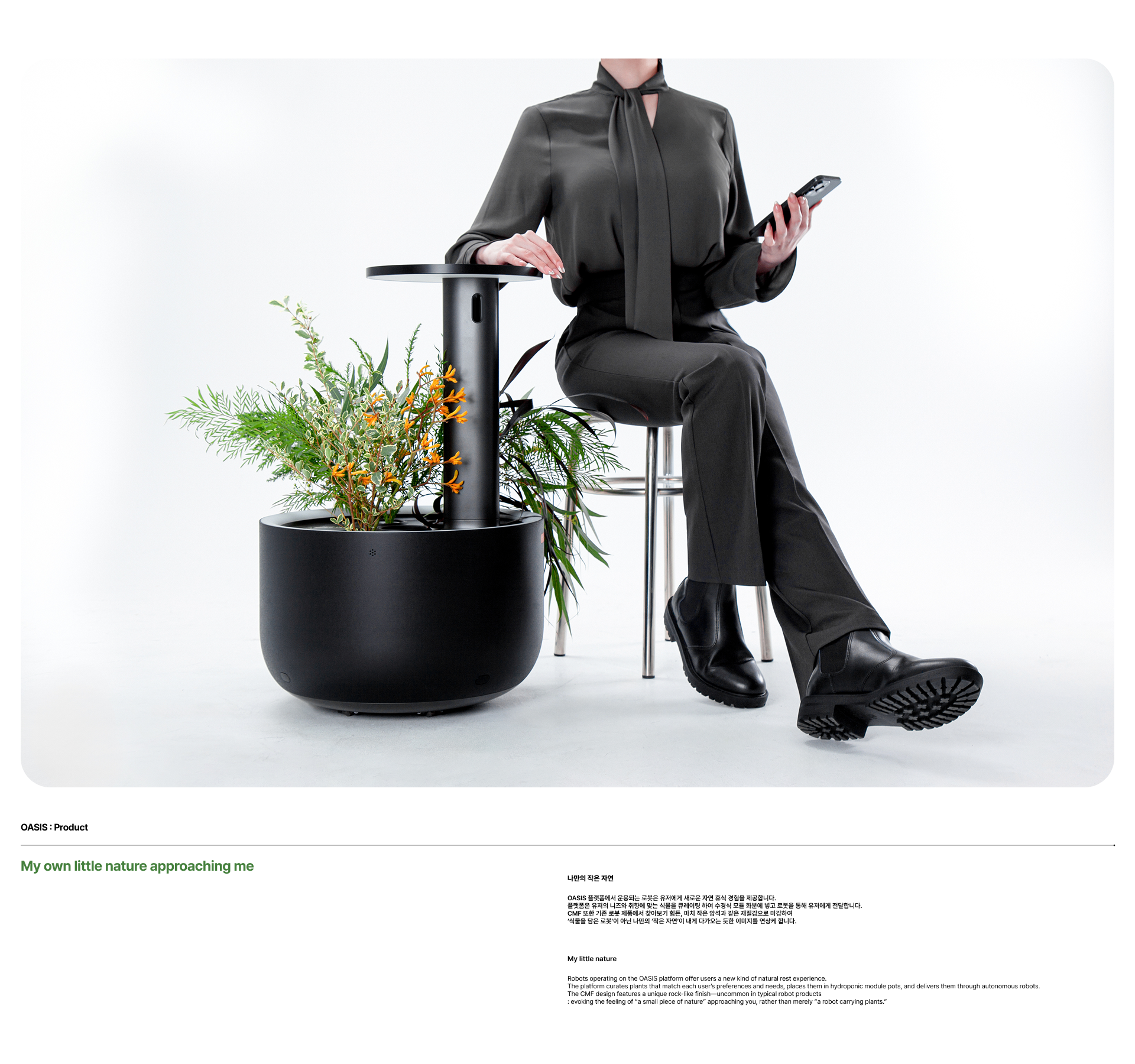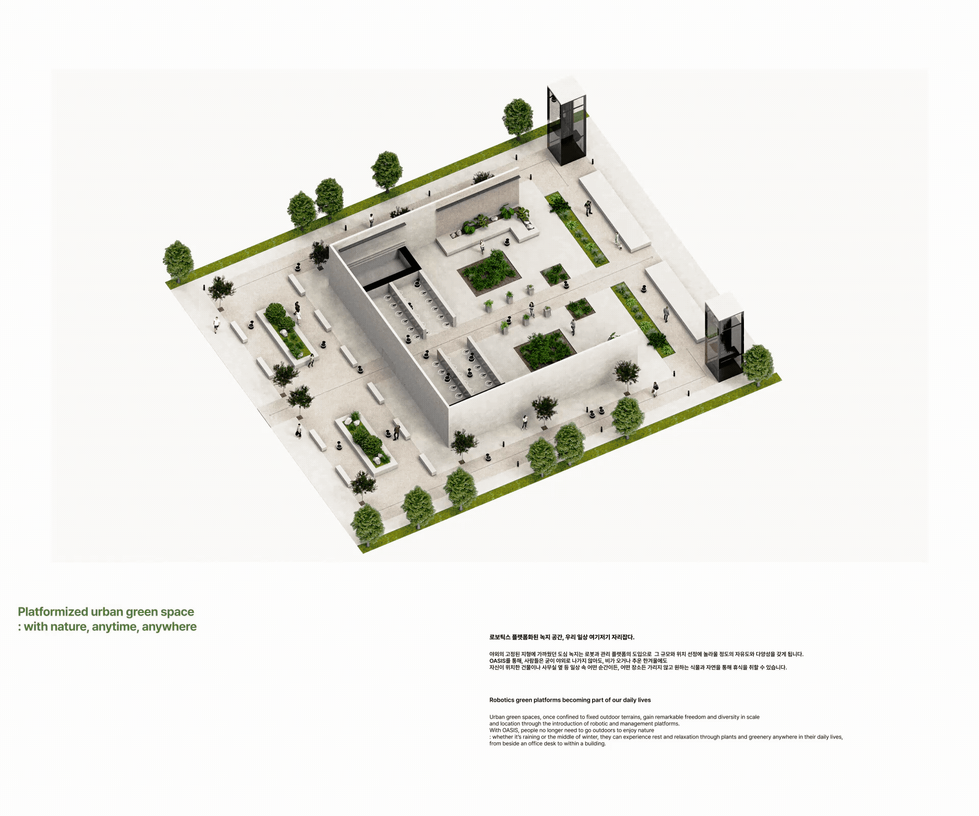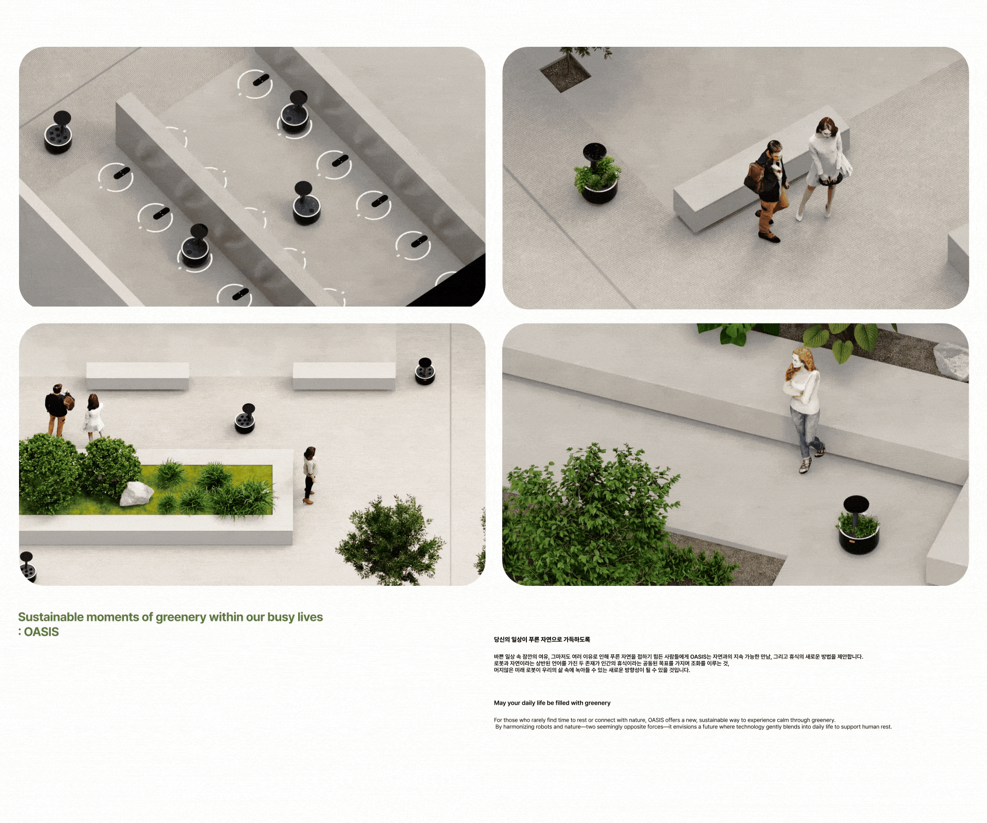 “OASIS” is an urban green robotics platform that reimagines parks and forests in the city, overcoming their limitations and providing people with refreshing, nature-friendly moments of rest.
