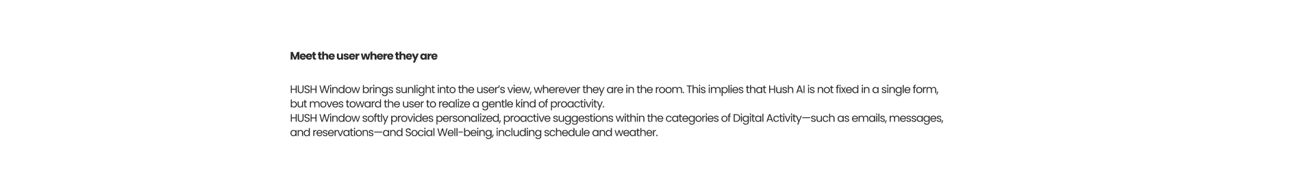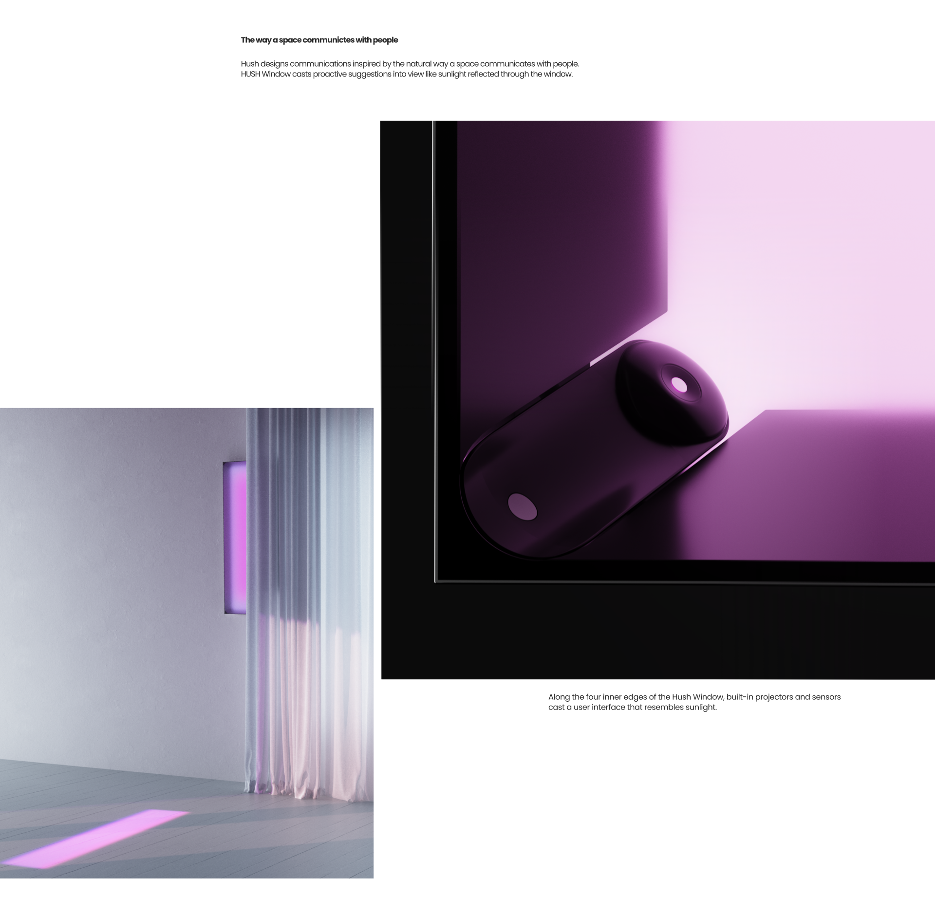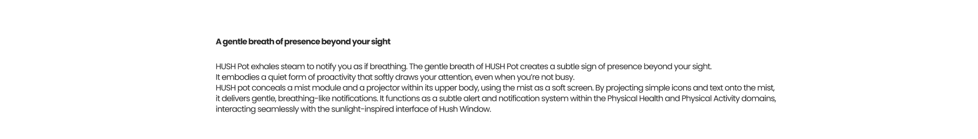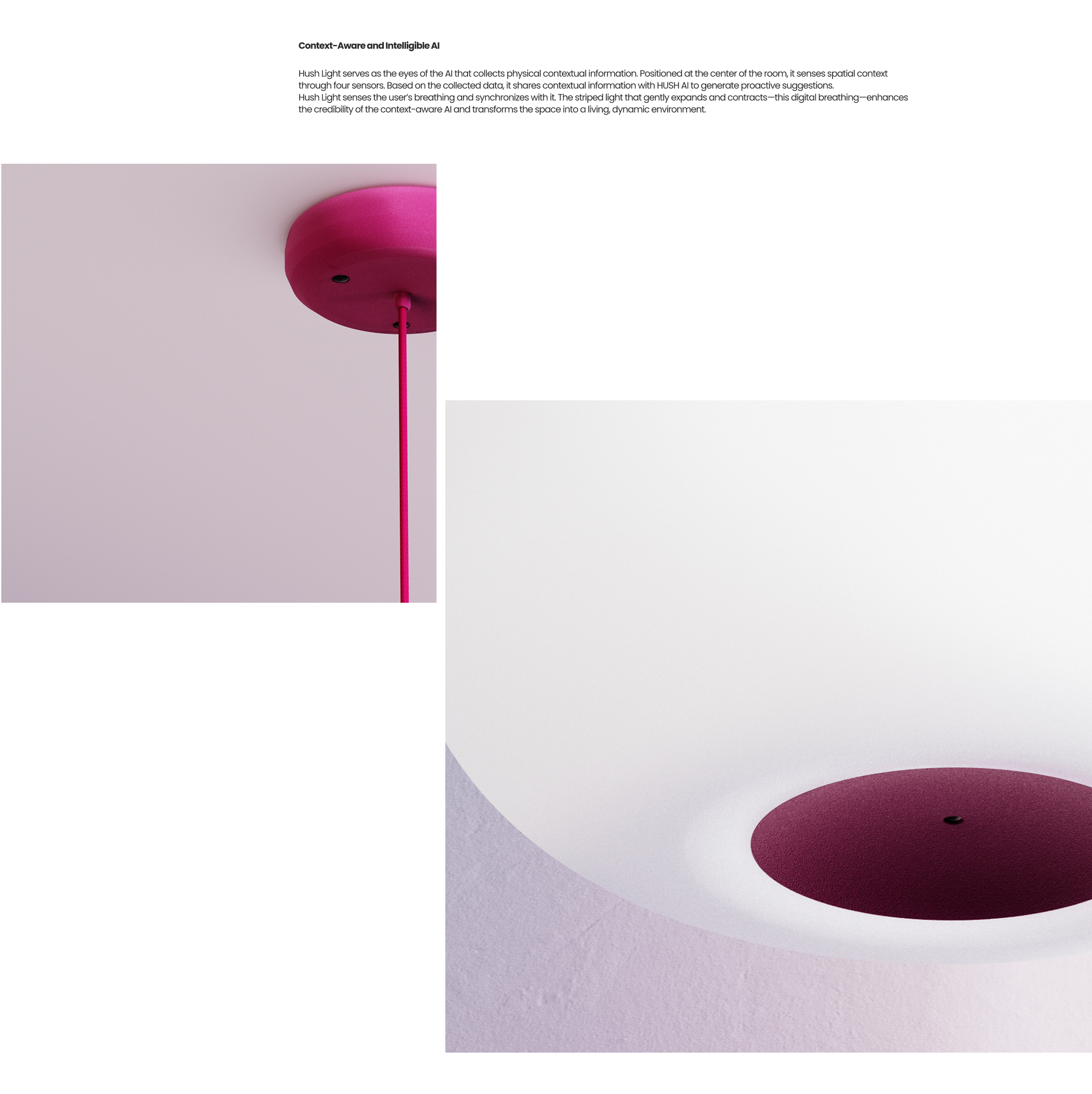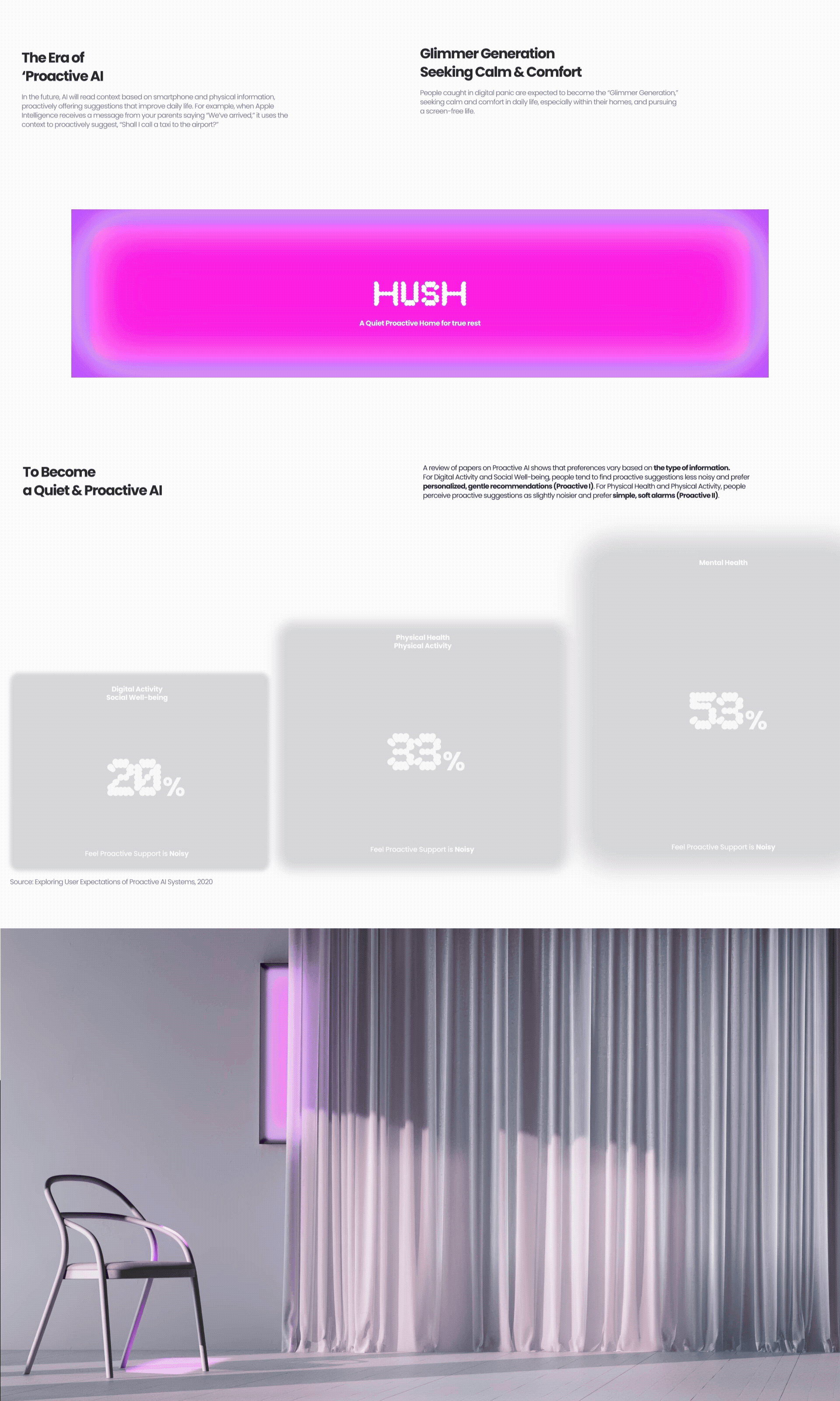 HUSH is a quiet, proactive home AI for true rest. It explores how spatial AI approach people gently. The home is a place of rest, and AI seeks to offer gentle yet proactive suggestions— a quiet, emotional form of proactivity.