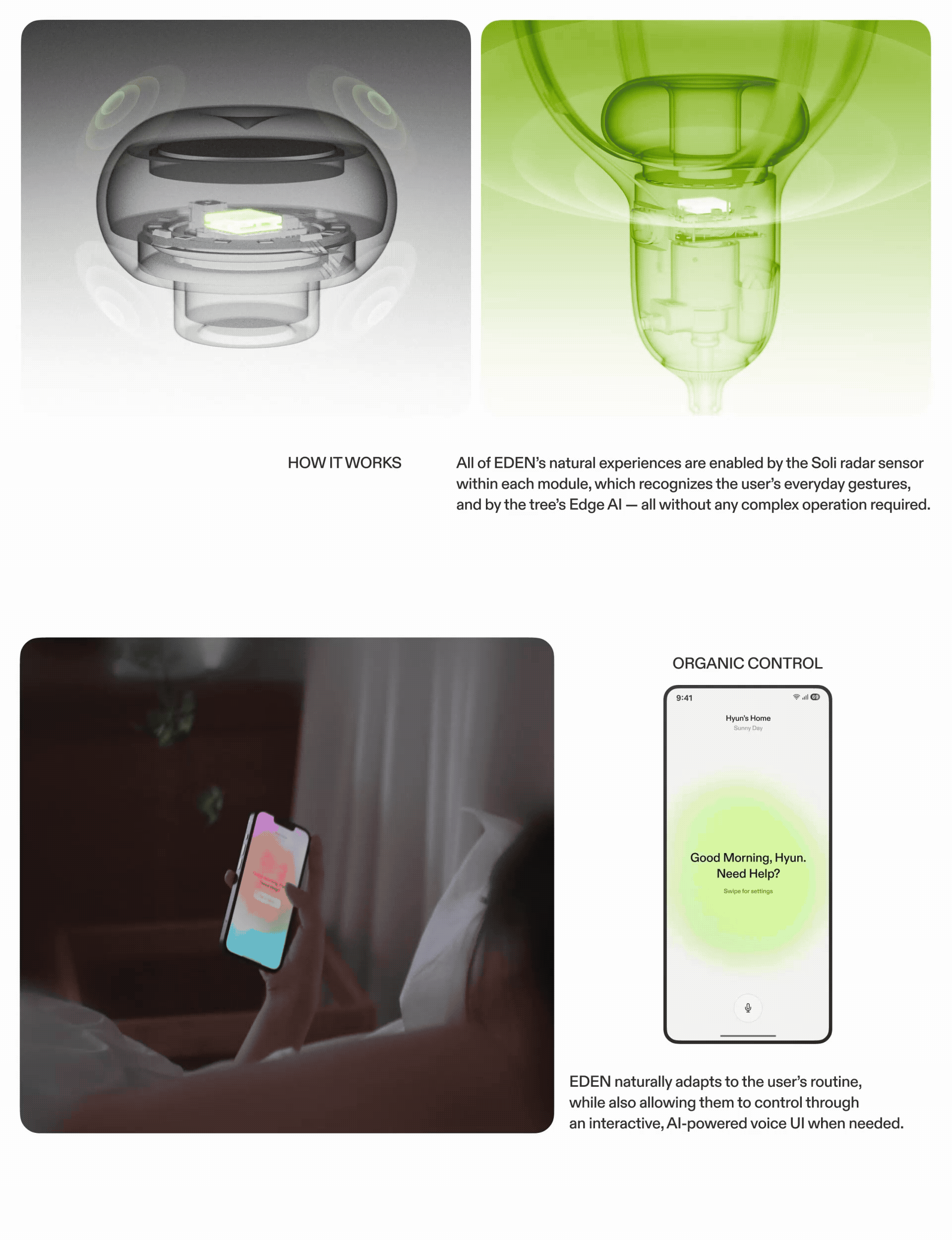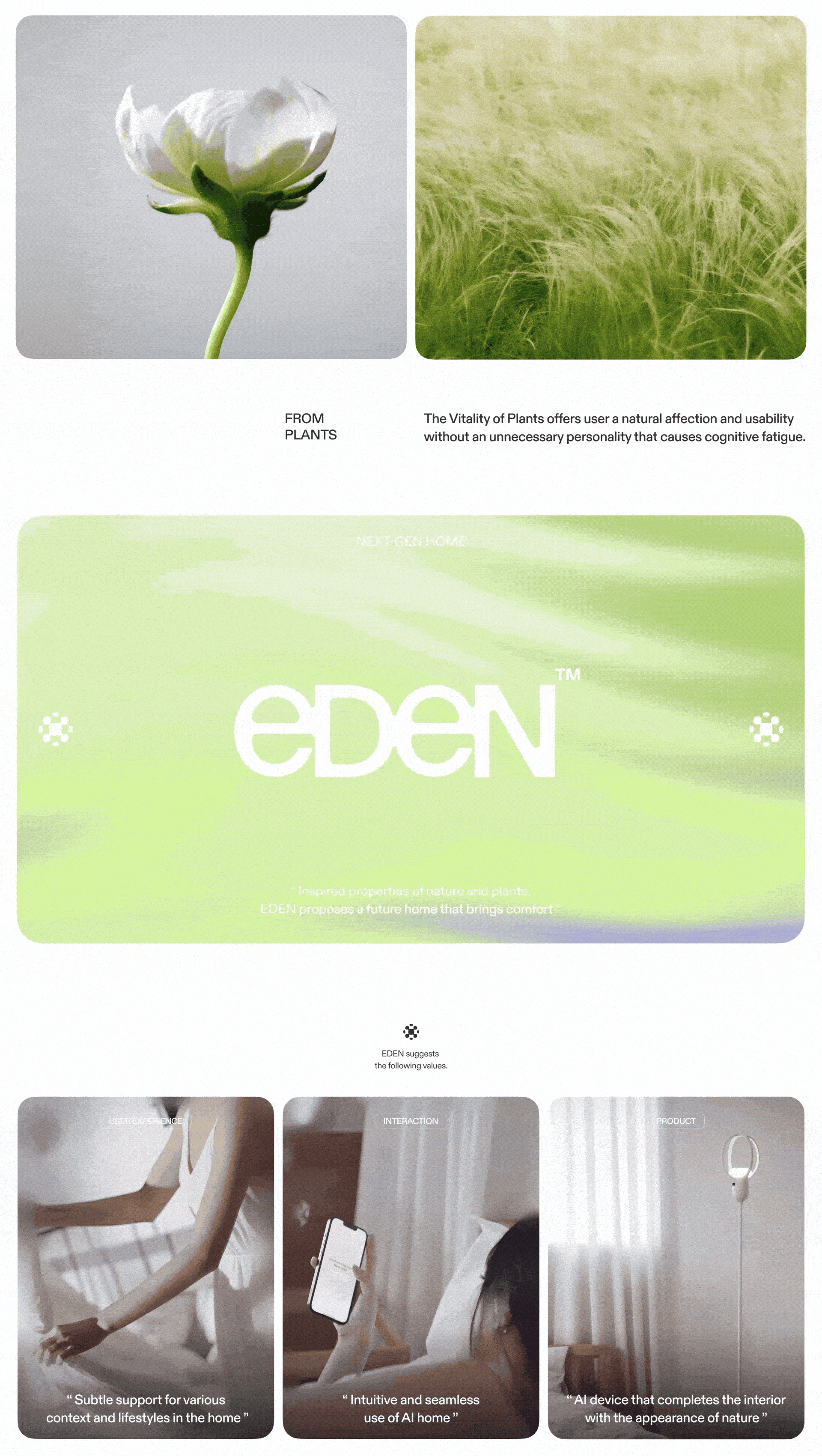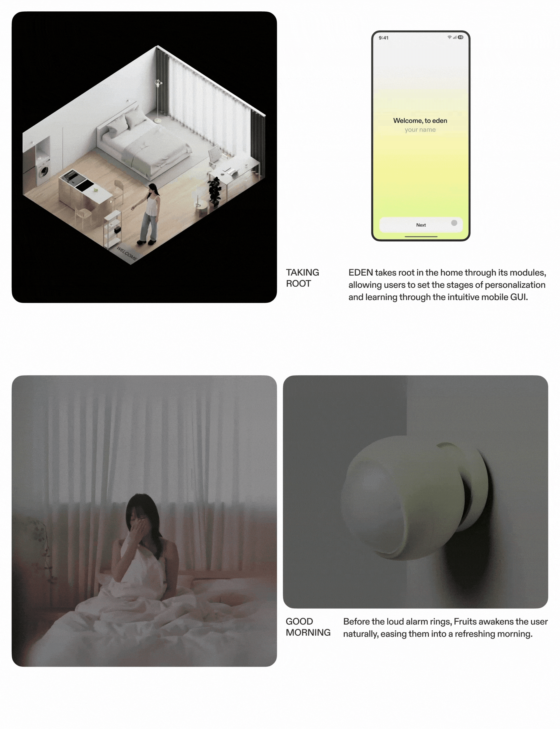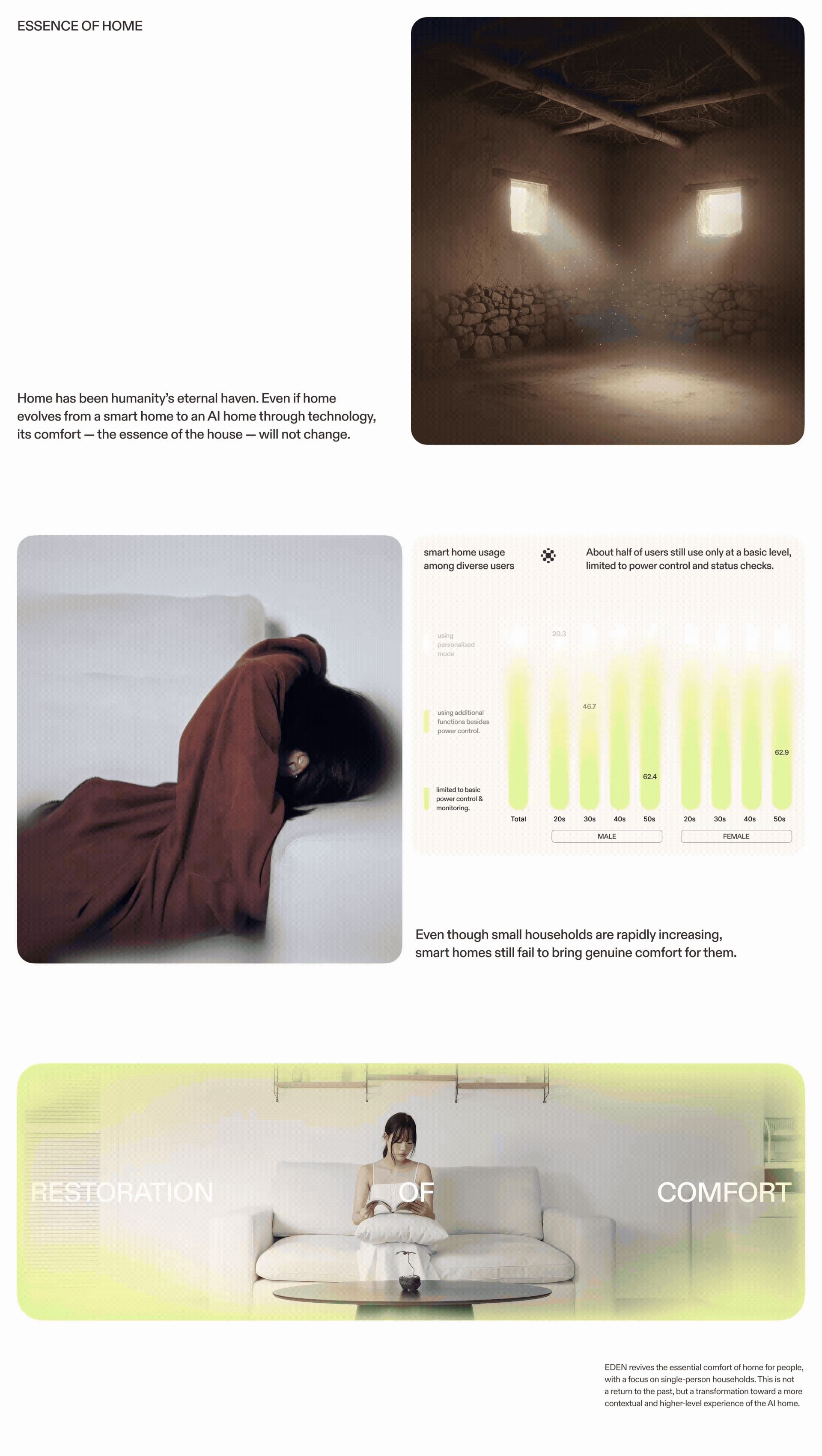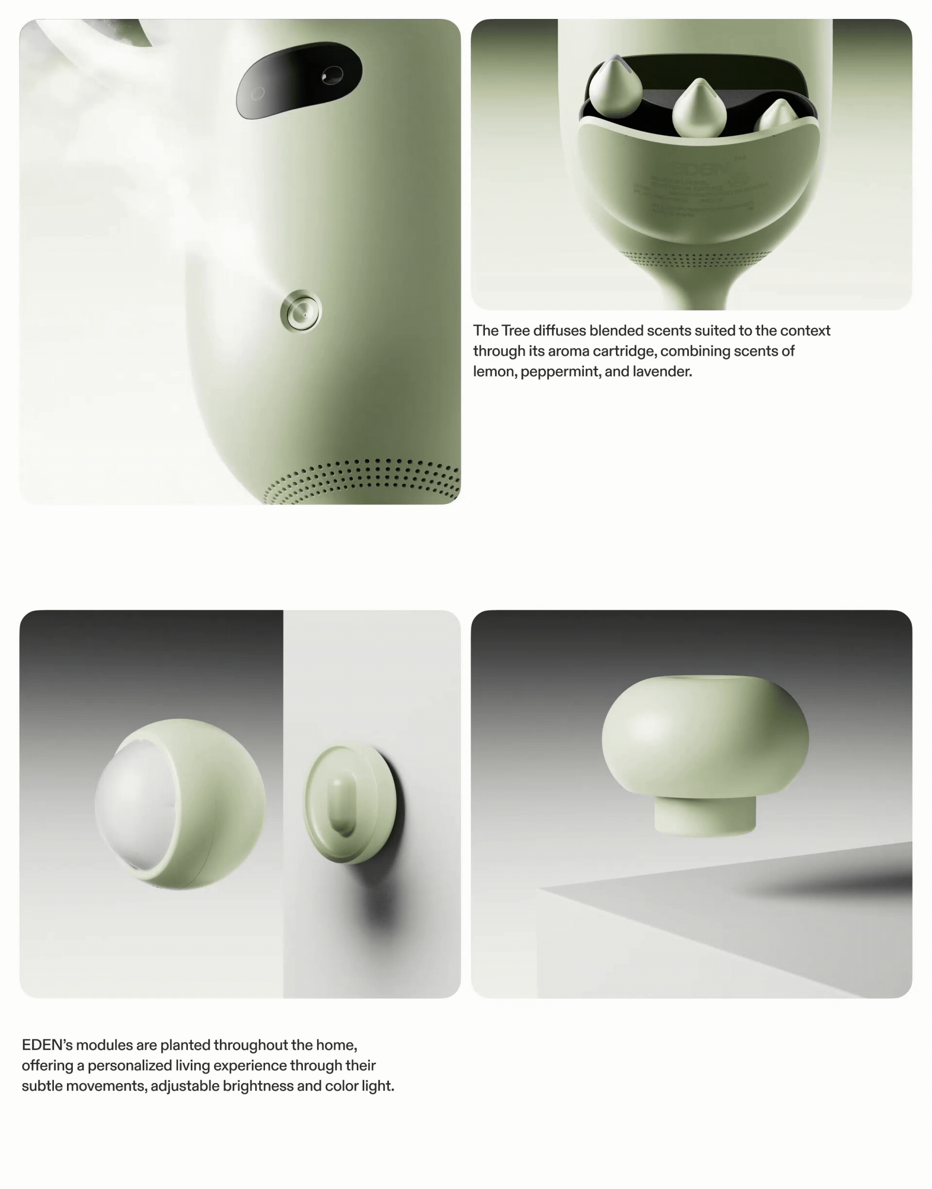 EDEN is an AI home ecosytem that restores the home’s essence — comfort. Today’s smart homes often fail to provide genuine comfort for diverse households. Inspired by nature and plants, EDEN creates an environment tailored to the user’s emotions and lifestyle through personalized light and scent, creating an “Eden” within the home. Thereby, EDEN offers a next generation home experience that goes beyond functional convenience to bring true comfort.